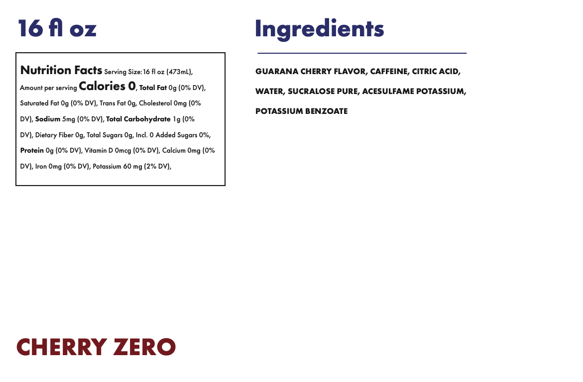 FlavorInfoThis has the same kick as our Cherry Soda, but without any of that sugar stuff. Prepare your taste buds for a blast of delicious cherry flavor with zero sugar and zero calories.Buy Now Nutritional Info
